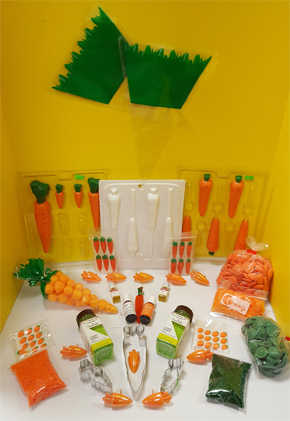 CHocolate & clear toy carrot molds, carrot cupcake picks, carrot cookie cutters, edible carrot shapes, edible candy shred & sprinkles. We also have green topped carrot bags to fill with cheesebals or popcorn.