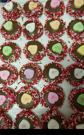 Oreo Cookies, chocolate dipped, topped with conversation hearts & sprinkles